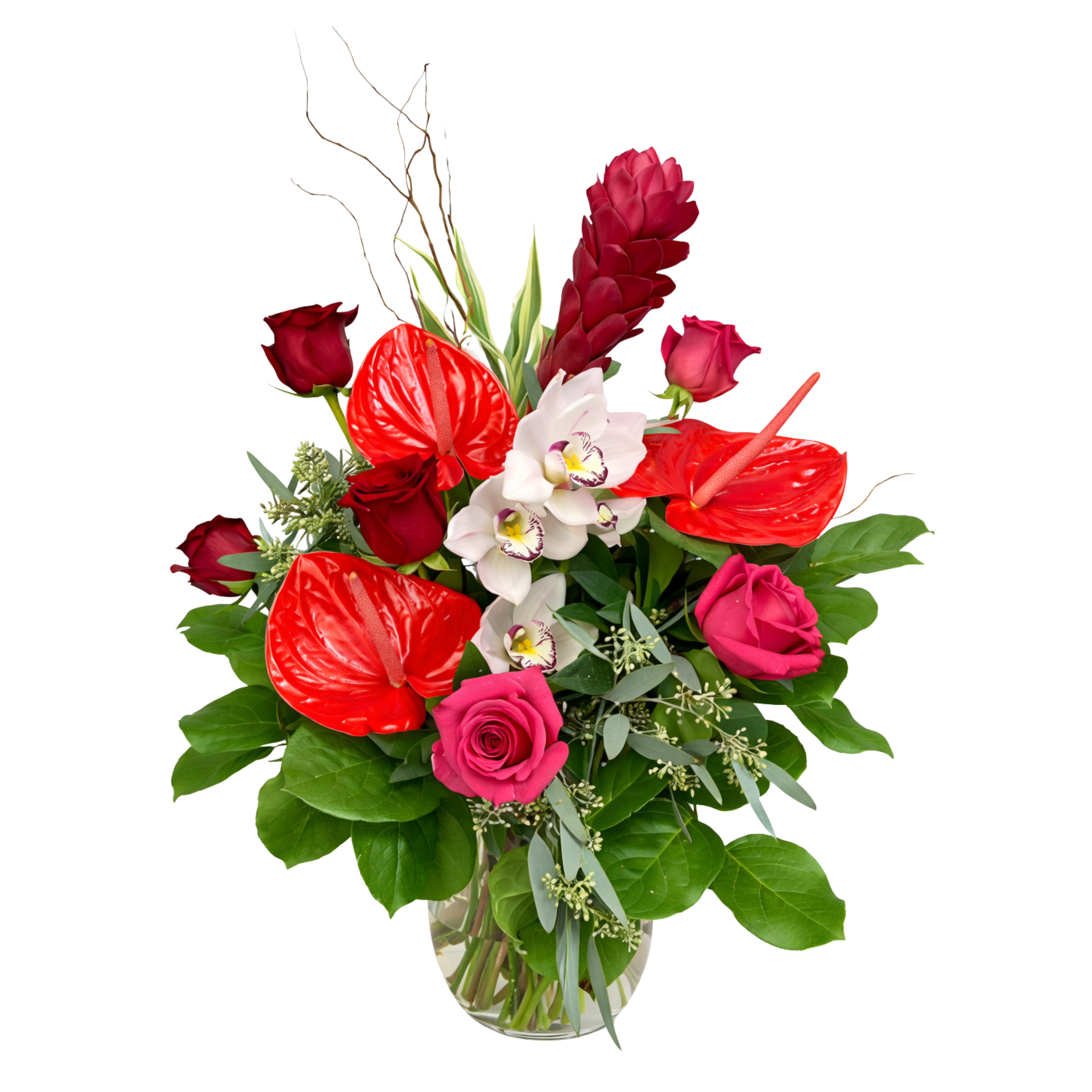 Bold, exotic, and beautifully expressive, this striking arrangement features lush red roses paired with vibrant anthurium, elegant orchids, and rich tropical foliage. Accented with fresh greenery and natural textural elements, the bouquet creates a dramatic and modern presentation with a touch of luxury.