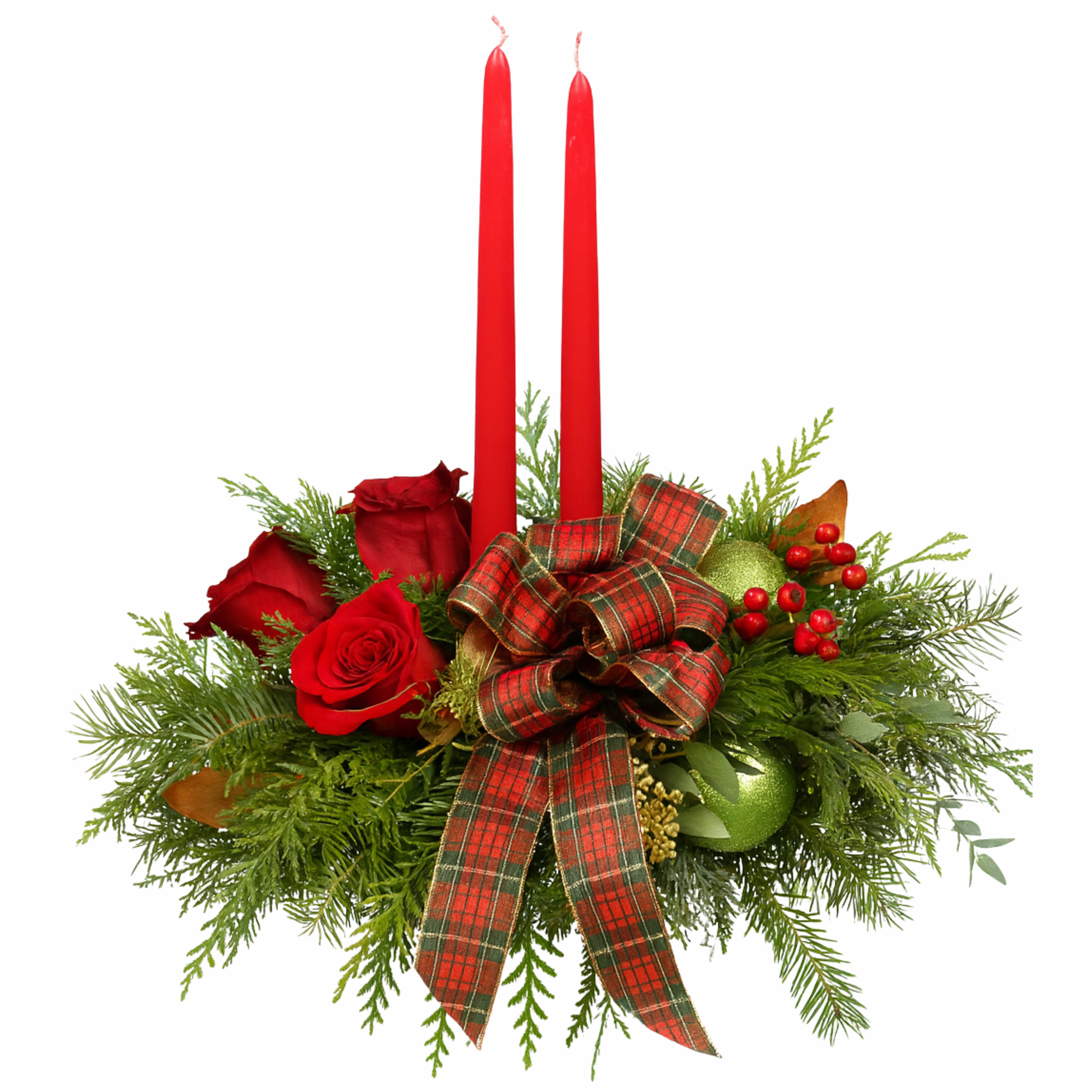Create a captivating holiday display with this beautifully crafted centerpiece. A combination of fresh Christmas greens, festive berries, pinecones, and decorative accents comes together with elegantly arranged candles to make a display that is cheerful, sophisticated, and full of holiday spirit. Decoration and color selection may vary.