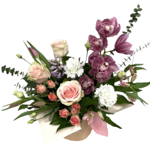 Orchid Garden Bliss’ is a stunning mix of cymbidium orchids, roses, hyacinth, tulips, lisianthus, and alstroemeria, beautifully accented with lush greens. Wrapped in a decorative box, this luxurious arrangement is the perfect way to show Mom just how much she’s loved!