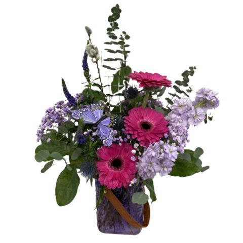 Escape to Pastel Paradise, where soft stock, cheerful gerberas, veronicas, and thistle bloom in a colorful vase. Adorned with a butterfly, it’s the perfect touch of serenity and charm.