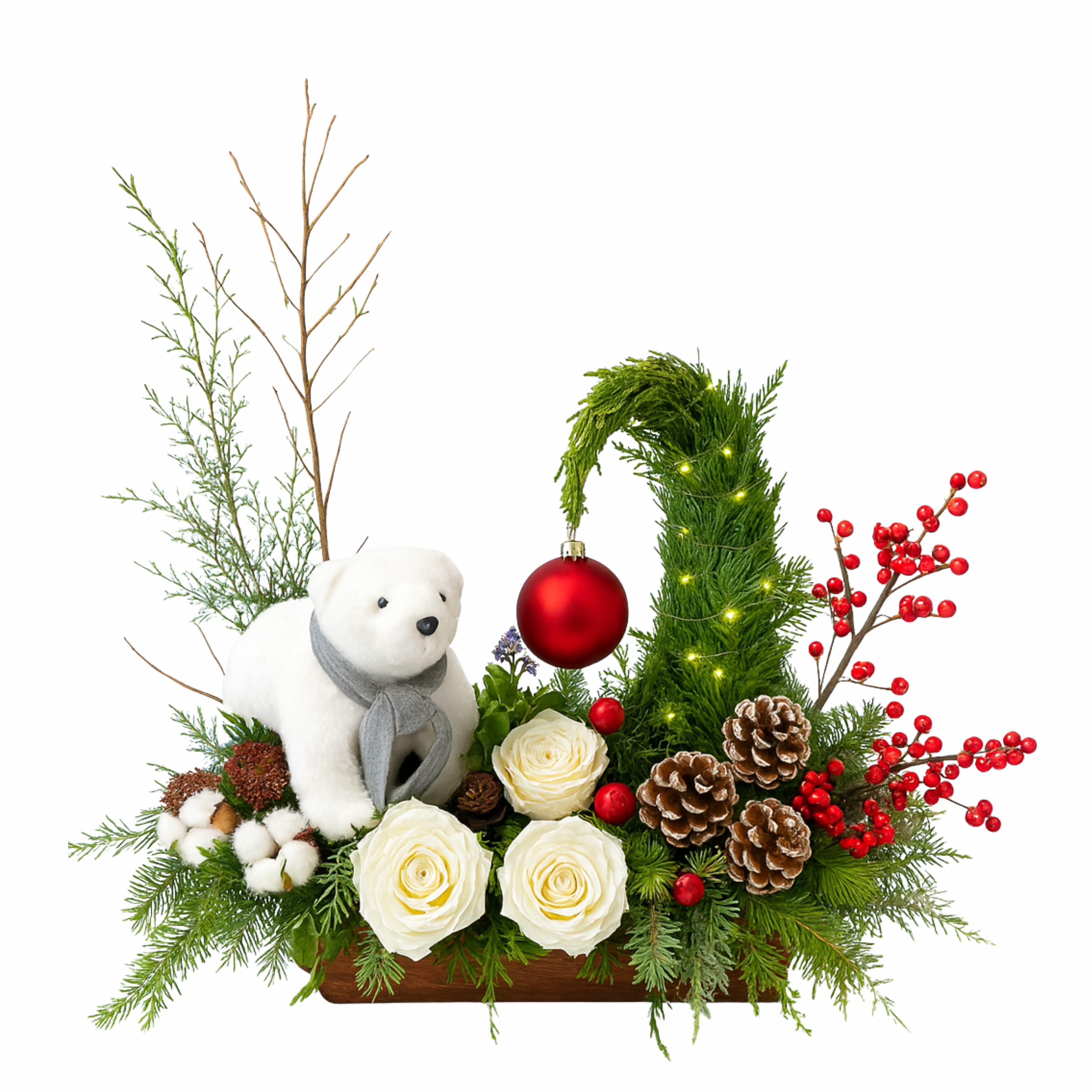 Step into a frosty holiday wonderland with Whispering Winter Pines. This enchanting centerpiece is brimming with fresh Christmas greens, delicate white roses, pinecones, festive berries, and whimsical winter accents, all arranged to evoke the serene beauty of a snow-kissed forest. A charming polar bear peeks through the greenery, adding a touch of playful magic, while the twinkling decorations bring the warmth and sparkle of the season into your home. Each arrangement is handcrafted, making every forest scene uniquely yours.