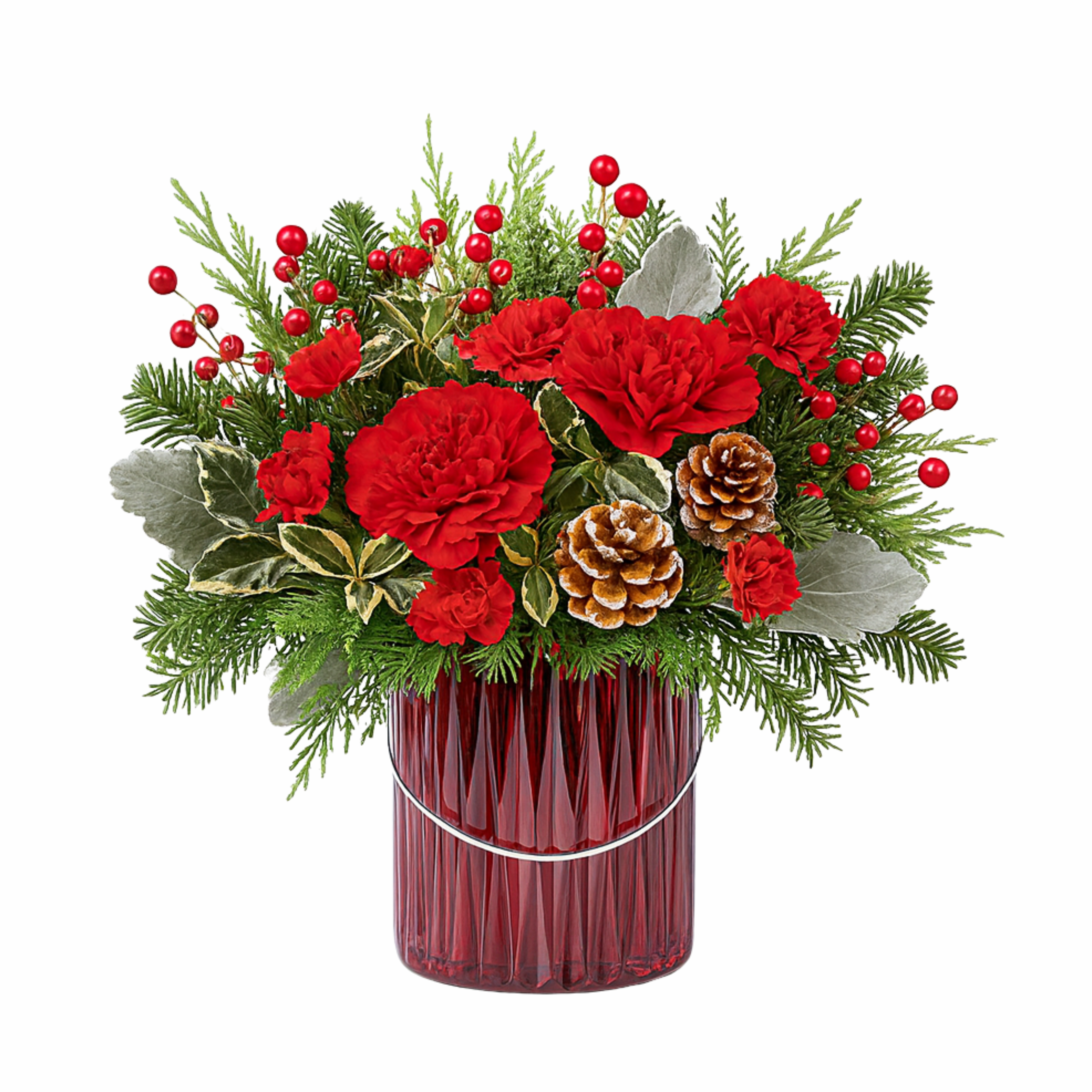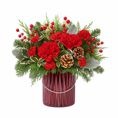 The splendor of the season is beautifully captured in this traditional holiday arrangement. The mix of blossoms, holiday greens, and textures is a brilliant way to say Merry Christmas! * Free delivery for online orders * Complimentary card message included