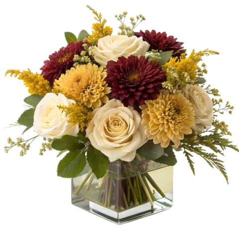 Your special someone is sure to fall in love with this fabulous Fall bouquet, featuring lush roses and warm autumn blooms in a gold cube. Container style and flower colour may vary but stay with autumn colour.