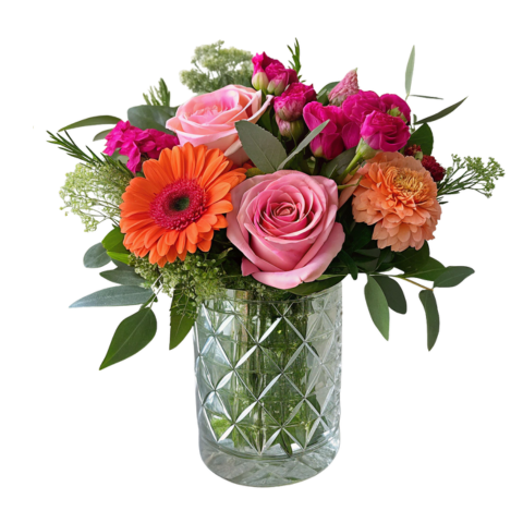 A joyful mix of roses, gerberas, daisies, carnations, and alstroemeria, ‘Blush Burst’ is a vibrant arrangement that pops with color and charm. Set in a sleek glass vase, this design is a beautiful way to fill any room with warmth and cheer.