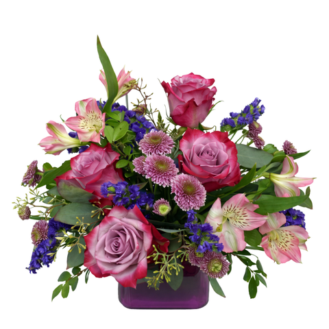 A radiant pink, pearlescent shimmer vase sets the stage for this lush arrangement of pink and purple blooms, adding a touch of artistic charm to any space. The flower selection may vary based on seasonal availability, ensuring each bouquet is uniquely beautiful.
