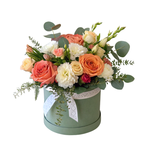 Celebrate Mom with this beautiful arrangement of roses, lisianthus, and carnations, accented with lush greenery in a stylish box container. To make her day even sweeter, enjoy a complimentary bag of premium toffee. A perfect way to show your love and appreciation this Mother’s Day!