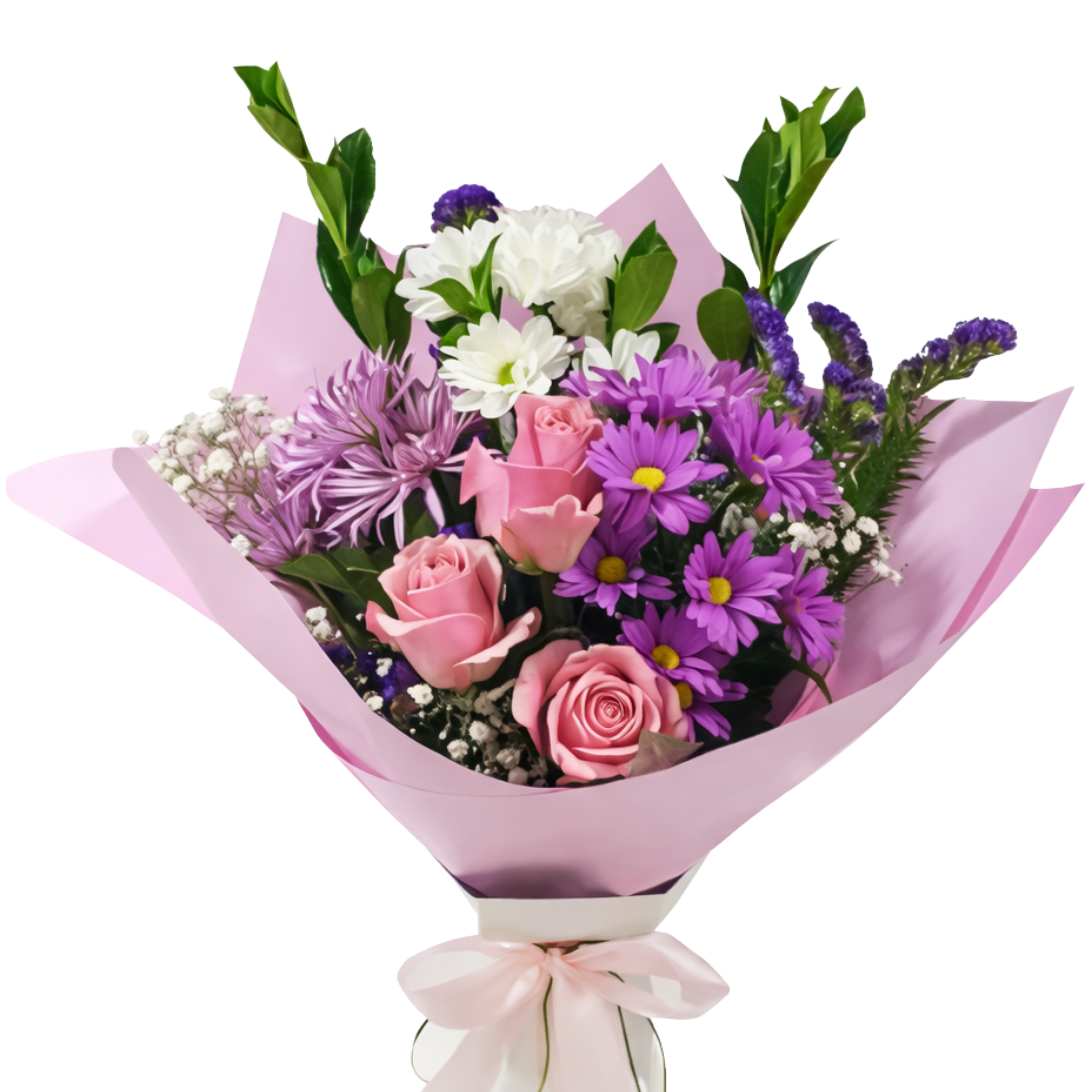 Soft, graceful, and beautifully arranged, this charming bouquet features delicate pink roses paired with fresh chrysanthemums, daisy blooms, and seasonal purple accents. Wrapped in elegant pastel paper and finished with a coordinating ribbon, the bouquet offers a light, romantic presentation full of texture and color.