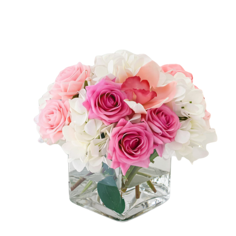 This elegant arrangement comes in a beautiful glass vase. It is the perfect size for a desk or a small table. The arrangement includes Hydrangea, Roses, and Orchids. Simply sweet, for any occasion!