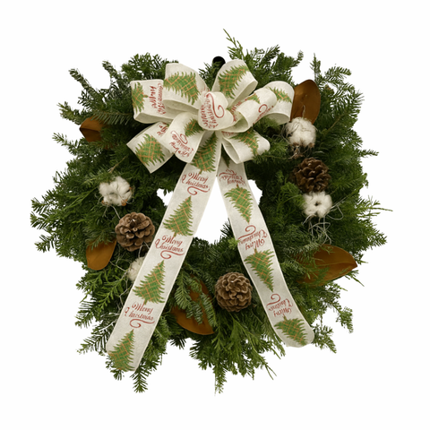 Celebrate the season with this 20" wreath crafted from lush Christmas greens and pinecones in a simple, natural style. Accented with soft decorative cotton balls and a charming ribbon, for effortless seasonal charm!