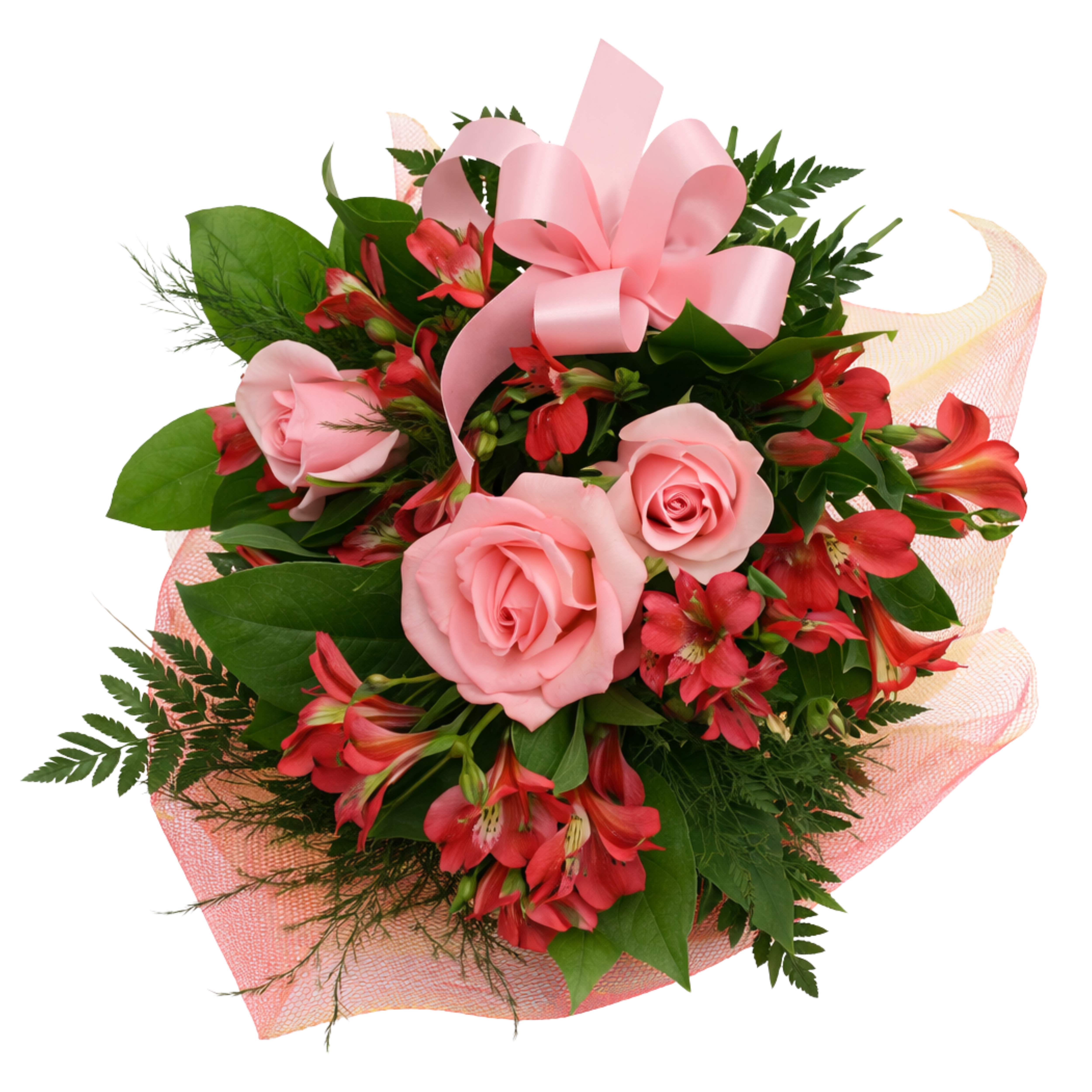 Lovely wrapped bouquet of 3 or more pink roses with pink or red alstroemerias, assorted greenery, and matching pink bow. A simple, affordable bouquet for anytime gift giving.