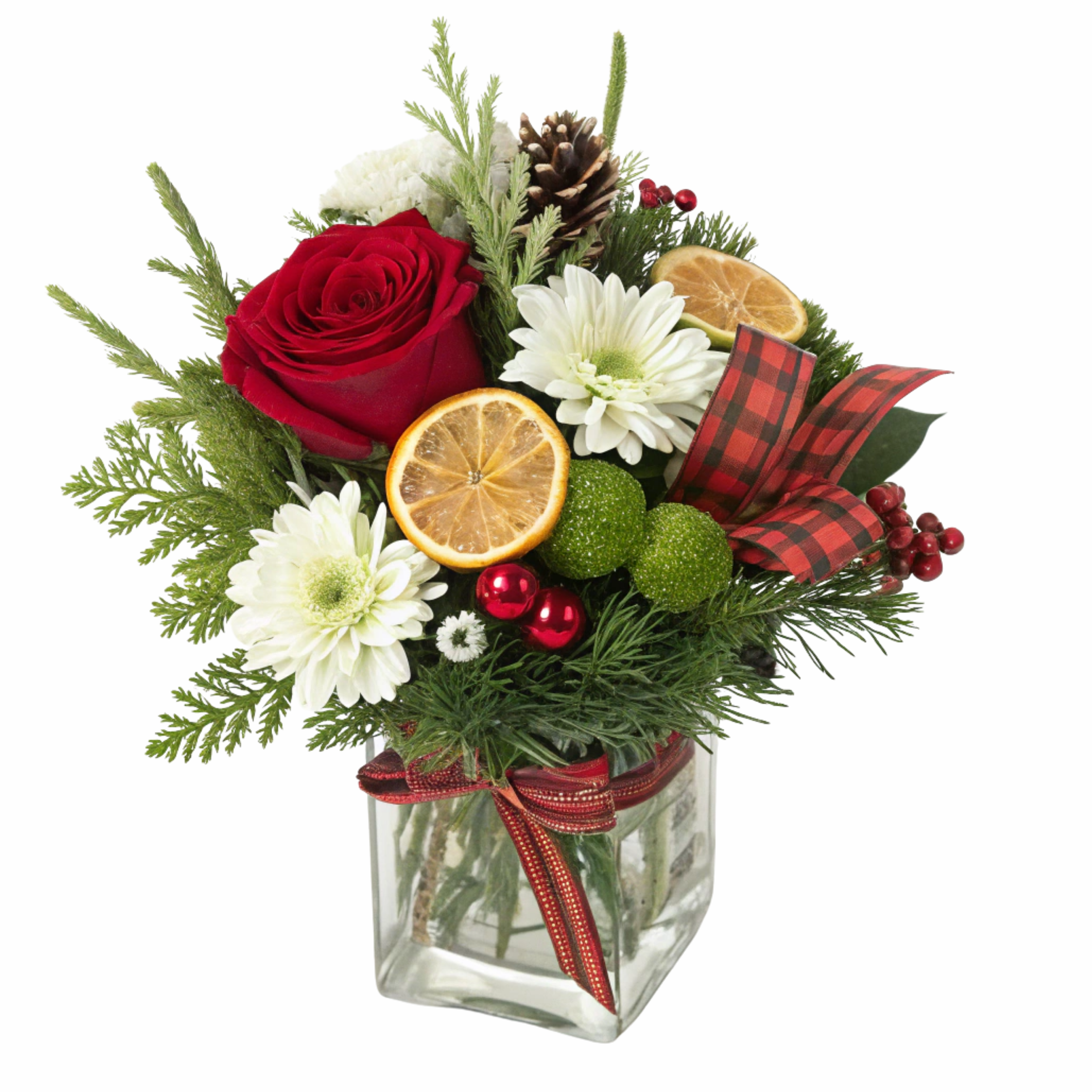 Get into the holiday spirit with Cozy Christmas, a playful mug arrangement packed with festive cheer. Bright blooms, cheerful accents, and a hint of dried orange make this handcrafted design the perfect gift—or a merry treat for your own home. Each piece is unique, with colors that may vary.