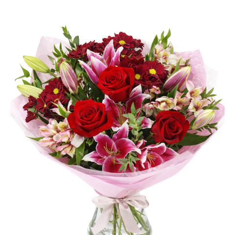 Romantic and vibrant, this stunning bouquet features rich red roses beautifully paired with elegant pink lilies and delicate seasonal accent blooms. Wrapped in soft pink floral paper and accented with fresh greenery, the arrangement offers a luxurious blend of color, texture, and gentle fragrance.