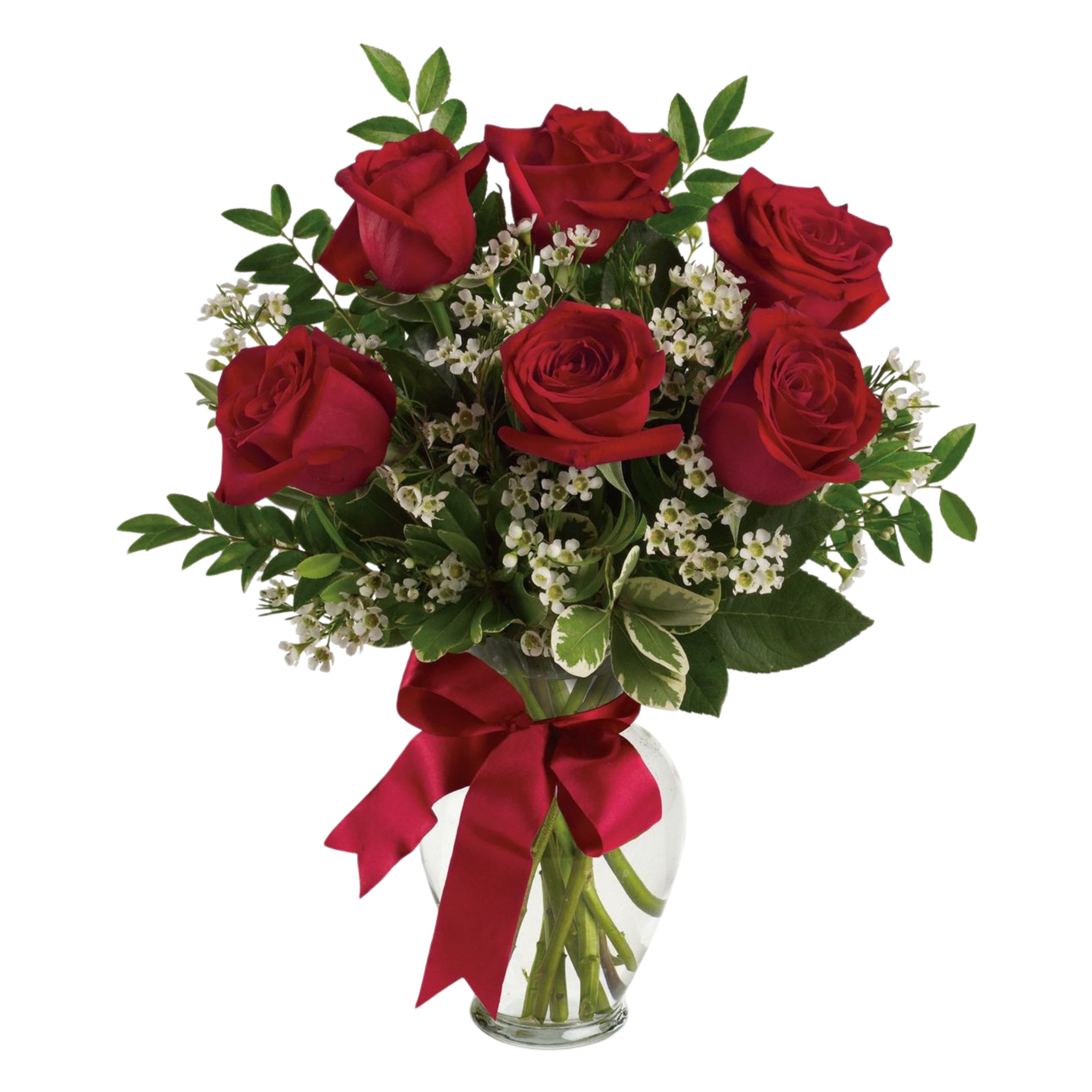 It’s the thought that counts—and it means even more when it’s expressed with six gorgeous red roses beautifully arranged in a clear glass vase. This timeless combination creates a sweet and meaningful surprise, perfect for sharing love, appreciation, or a heartfelt message.
