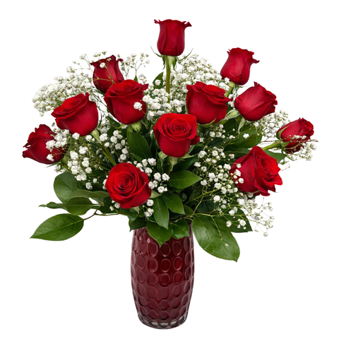 Venus combines a dozen premium red roses with delicate baby’s breath and fresh greenery, elegantly arranged in a clear glass vase. Bold yet graceful, this bouquet adds a vibrant, sophisticated touch to any occasion, effortlessly elevating the atmosphere with its timeless appeal.