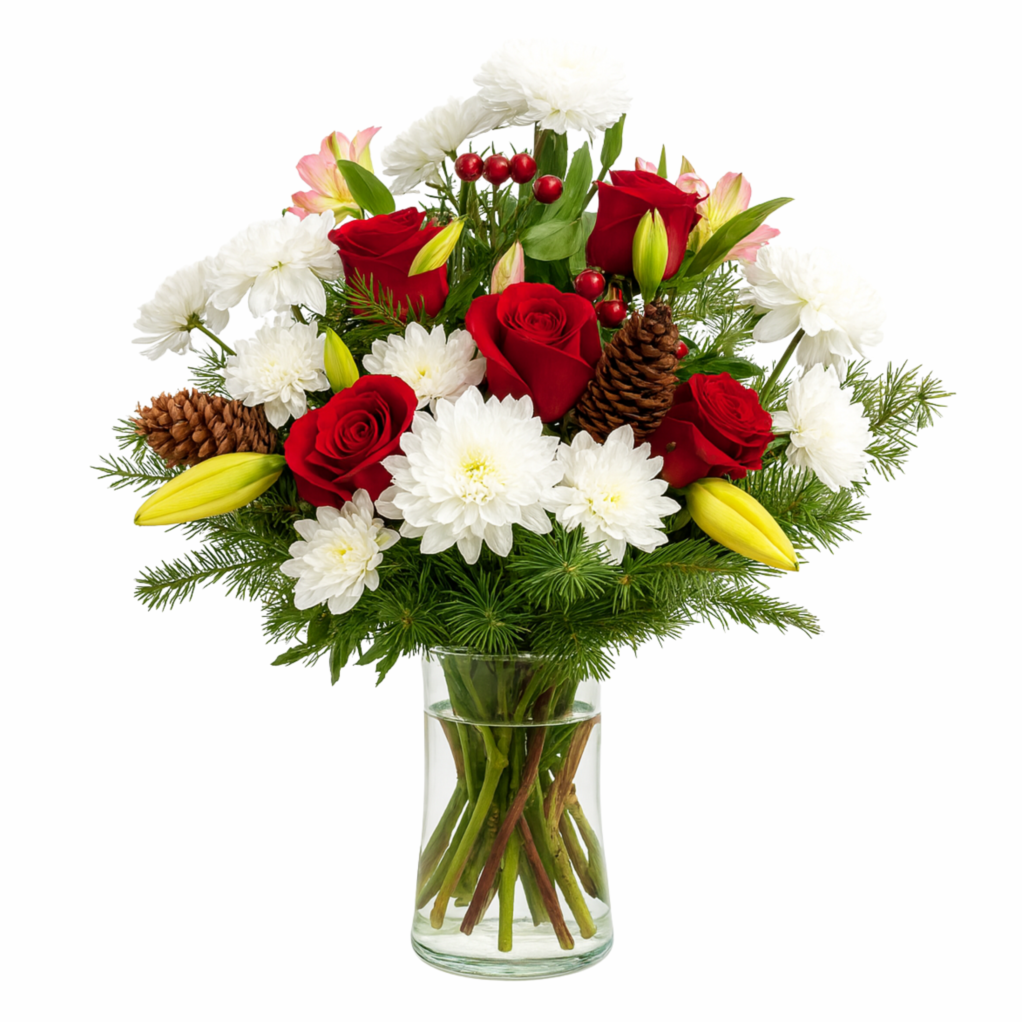 WAKE UP, SANTA! is the perfect mix of traditional holiday spirit and playful charm. Featuring red roses, white daisies, alstroemeria, white Asiatic lilies, berries and pinecones, this arrangement is sure to bring a smile to Santa’s face—and yours! It’s the perfect way to brighten up the season with a little extra holiday joy. Whether you're decking the halls or gifting a friend, this arrangement is a delightful reminder that Christmas can be fun, fresh, and full of surprises! Please note that colour and flower selection may vary.