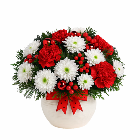 This arrangement features red carnations, white daisies, Christmas greens, a pinecone, berries and a festive bow in a red cube vase. Please note that colour, decoration and flower selection may vary.