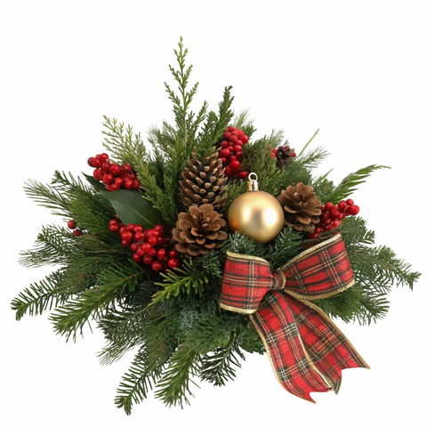 Add a sparkle of holiday fun with Holly Jolly Nights. Featuring fresh Christmas greens and adorned with festive decor such as baubles, pinecones, berries, and a lively bow, this centerpiece captures the joyful spirit of the season. Each arrangement is handcrafted, so colors and accents may vary.